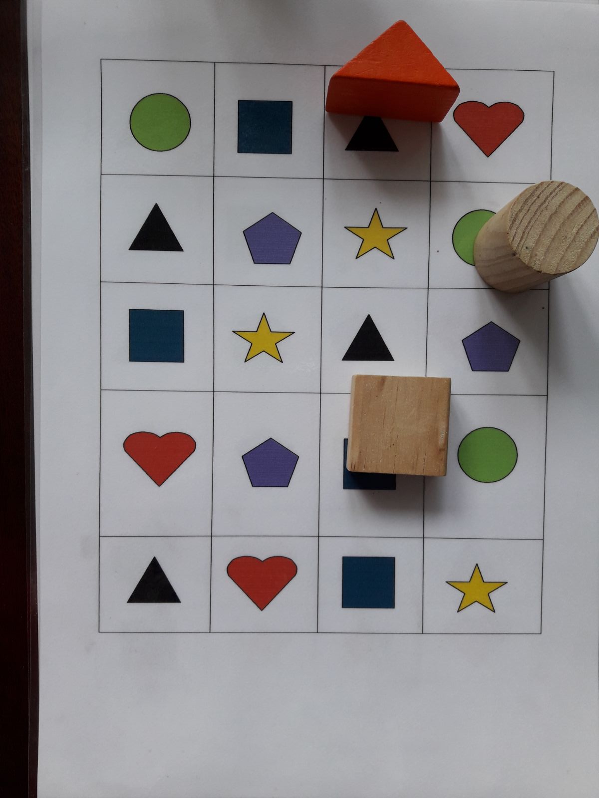 - Na 6 kartkach papieru albo w programie Word (lub jakimkolwiek innym, którym sprawnie operujemy) robimy tabelkę, w którą wrzucamy nasze kształty z kostki. Ich rozmieszczenie nie ma żadnego znaczenia, dlatego losowo umieszczamy symbole obok siebie i drukujemy. Można też plansze zrobić własnoręcznie, rysując tabelkę, a w niej kształty. Możecie też pobrać gotowe plansze – link do pobrania znajdziecie pod wpisem. Wszyscy mogą mieć taką samą planszę lub każdy różną. Zarówno wersję drukowaną, jak i rysowaną, najlepiej zalaminować, aby móc się dłużej bawić.